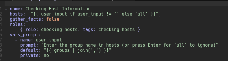 prompt: "Enter the group name in hosts (or press Enter for 'all' to ignore)"