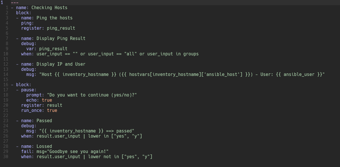 At the top, we define the server pool to run the playbook and its name using the user_input variable declaration. We then identify a list of servers to test.